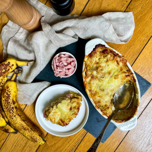 Ce gratin de bananes plantains est une véritable invitation au voyage entre douceur et gourmandise. Les bananes, à la fois mûres et légèrement fermes, apportent une texture fondante et sucrée-salée irrésistible. Mariées àune béchamel onctueuse relevée d’un soupçon de piment végétarien et aux morceaux savoureux de jambon fumé, elles se transforment en un plat réconfortant et généreux. Le tout est gratiné au four sous une couche dorée de fromage fondant… une explosion de saveurs à chaque bouchée. Parfait pour surprendre vos invités ou redécouvrir la banane plantain autrement, dans une version fondante et pleine de caractère.